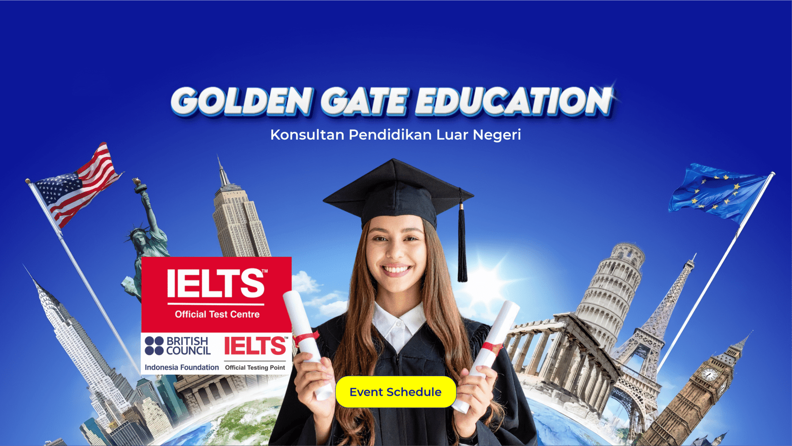 Sejak tahun 1996, Golden Gate Education telah memandu para siswa menuju impian mereka untuk studi di luar negeri. Sebagai agen konsultan pendidikan luar negeri yang terpercaya, kami berspesialisasi dalam menghubungkan siswa Indonesia dengan universitas dan program kelas dunia di seluruh dunia.